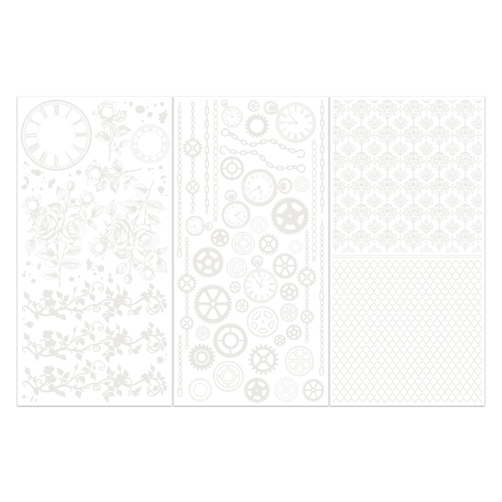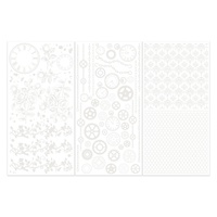 Discover the magic of mixed media with the new Irresistible Rub-on Transfers from 49 and Market. These innovative white rub-on transfers feature new technology that creates a no-halo background, eliminating the ghostly effect often seen on dark papers. This unique feature also allows you to add ink directly over the transfers to resist the design, opening up a world of creative possibilities. The Irresistable Times set from Joanne Bain includes vines, cogs (gears), and various textures. These rub-ons are typically used in scrapbooking, card making, and other paper crafts to add intricate details and a vintage or steampunk aesthetic.