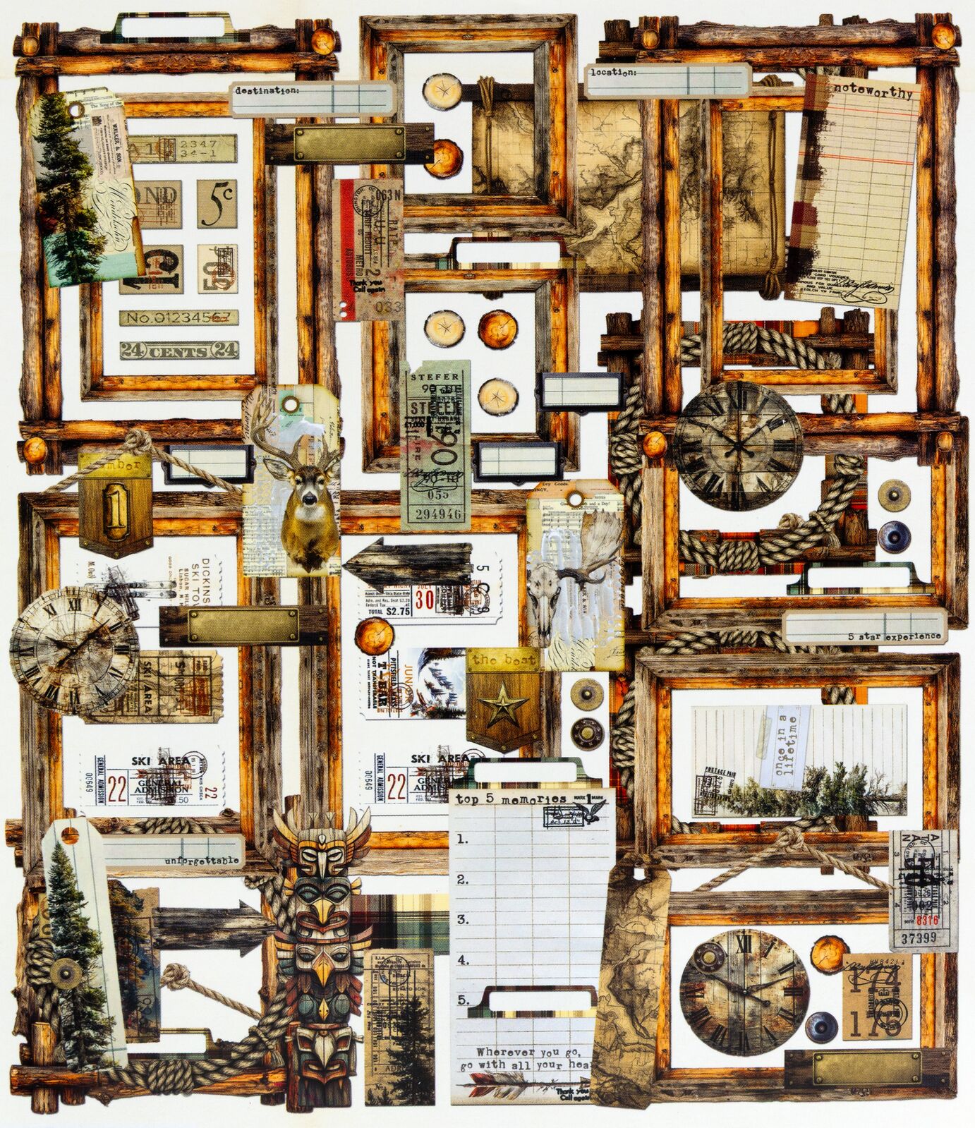 "Step into a world of cozy heritage and woodland elegance with the Timber and Tweed Ephemera and Frames collection. This curated assortment is designed to add layers of texture, history, and personality to your scrapbooks, junk journals, and handmade cards.Inspired by the tactile warmth of hand-woven wool and the rugged beauty of the forest, this pack features a rich palette of moss greens, deep mahoganies, and classic houndstooth patterns. Whether you are documenting a weekend at the cabin or a quiet afternoon in the library, these pieces provide the perfect ""lived-in"" aesthetic.Whats Inside the Pack:Ornate Frames: A variety of die-cut frames in woodgrain textures and vintage finishes to spotlight your favorite photos or sentiments.Antique Tickets & Tags: Evoke a sense of travel and nostalgia with weathered tickets and reinforced shipping tags.Functional File Tabs: Organize your projects with stylish tabs that look like they were pulled straight from an old-world apothecary.Journaling Pieces: Dedicated spots for your stories, featuring subtle grids, ledger lines, and botanical accents.Assorted Ephemera: A mix of ""bits and pieces"" including faux-vantage advertisements, rope hangers, totem pole and more."