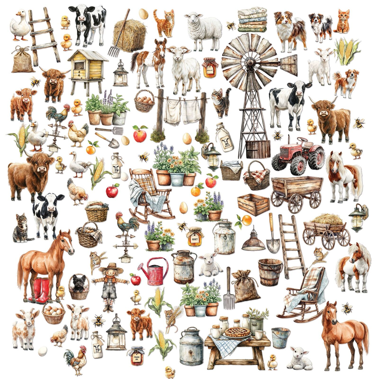 Step into the serene world of the countryside with Joanne Bain's Whispering Way Laser Cut Elements. Designed especially for farm people and lovers of rustic charm, this sweet collection captures the heart of rural life. Adorn your projects with beautifully detailed laser cuts, including an adorable menagerie of cute animals, a towering windmill, fresh plants, and classic farm motifs like a rolling wheelbarrow, trusty tractor, and graceful weathervane. It's the perfect way to add that wholesome, farmhouse feel to any creation.