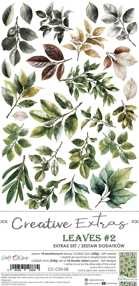 A set of 18 double-sided pages of a high quality scrapbooking paper with extra elements to cut (2x9 designs) + 2x sheet with EXTRAS TO CUT on the other side of the cover. Every page is of a 15,25x31,5cm size. The paper weighs 250g/m2.