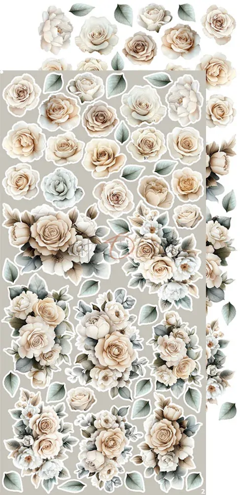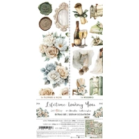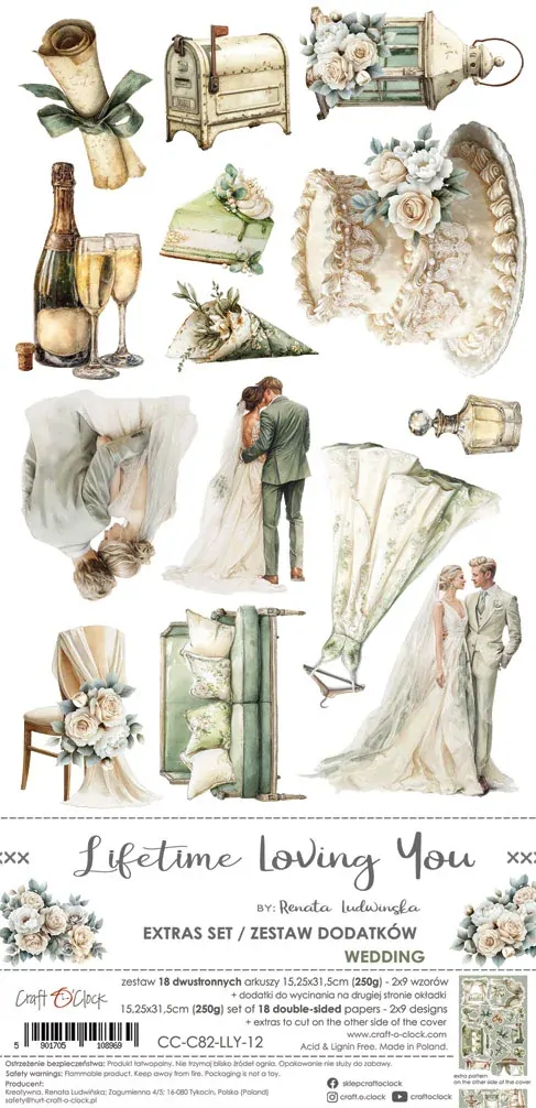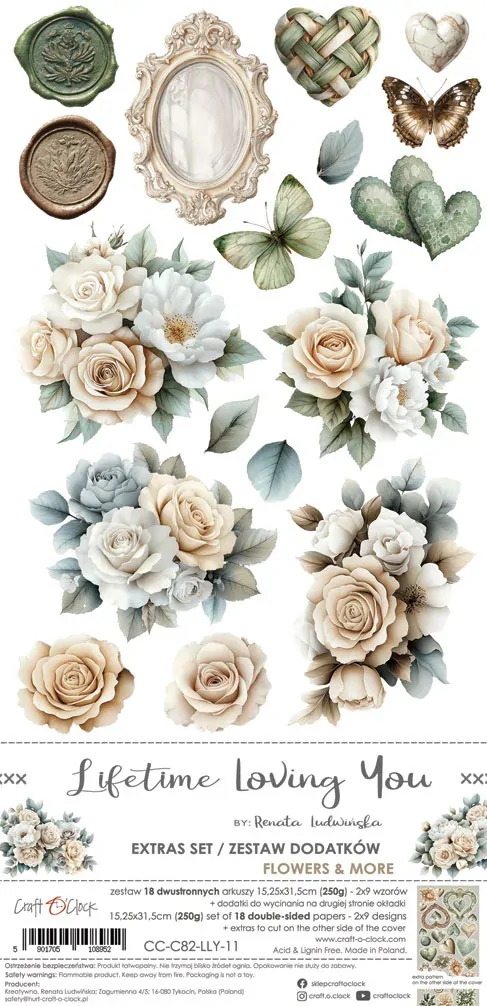 A set of 18 double-sided pages of a high quality scrapbooking paper with extra elements to cut (1x18 designs) + 3x sheet with EXTRAS TO CUT on the other side of the cover. Every page is of a 15,25x31,5cm size. The paper weighs 250g/m2.