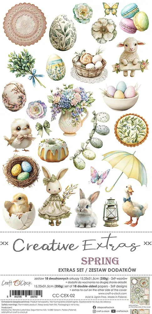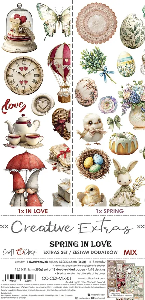 A set of 18 double-sided pages of a high quality scrapbooking paper with extra elements to cut (2x9 designs) + 2x sheet with EXTRAS TO CUT on the other side of the cover. Every page is of a 15,25x31,5cm size. The paper weighs 250g/m2.