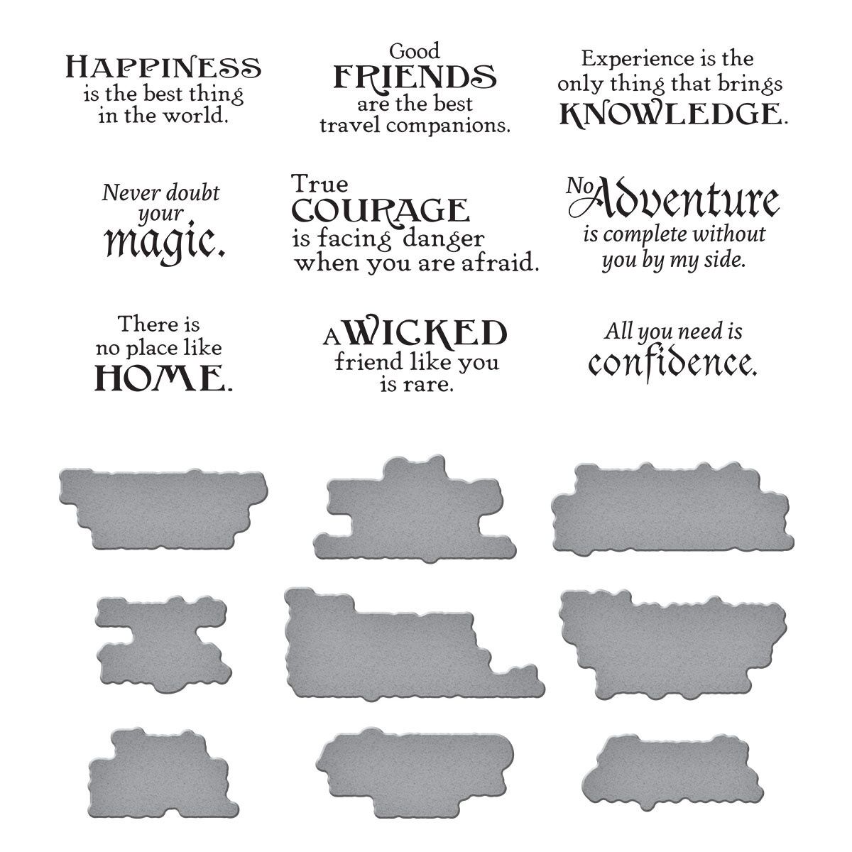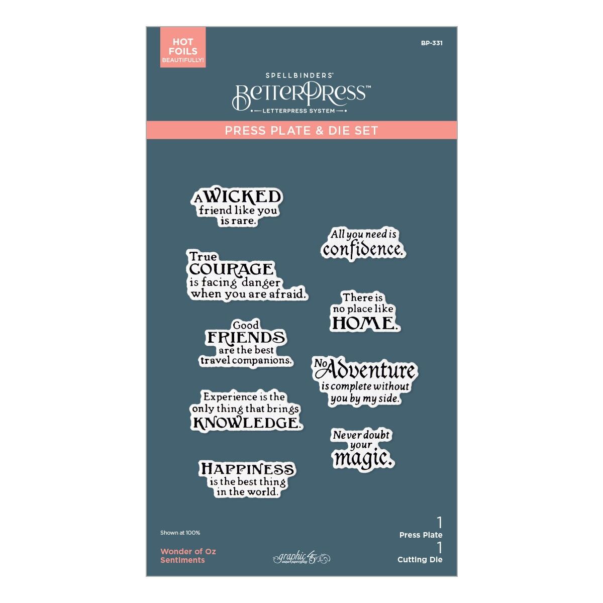 Wonder of Oz Sentiments BetterPress Plate & Die Set is part of the Wonder of Oz Collection by Graphic45. Press nine sentiments at the same time and then die-cut them with its matching thin metal cutting die all in one pass! Great time saver and youll have many sentiments on hand. Ink the plates with the BetterPress Ink to be pressed against the BetterPress Cotton Card Panel and Sheets for a crisp letterpress design. Only four easy steps for professional results! Follow the yellow brick road to go on a creative journey with Graphic45 + Spellbinders! Together with the patterned papers and elements from the amazing Wonder of Oz Collection, this charming offering of dies, embossing folder and BetterPress plates brings these characters and designs to life!